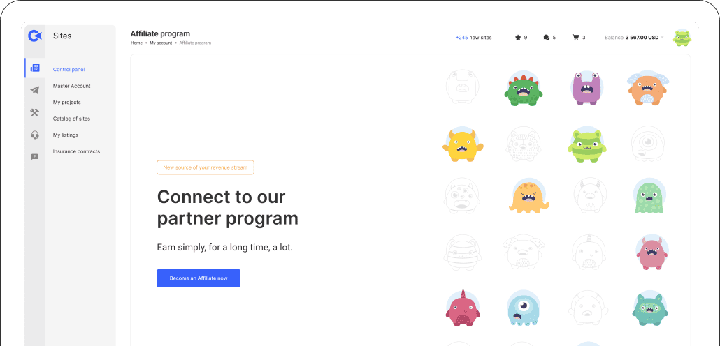After registration you will have access to a convenient dashboard with statistics of your referrals. You will see registrations, payments, incomes and the total amount of revenue✌️